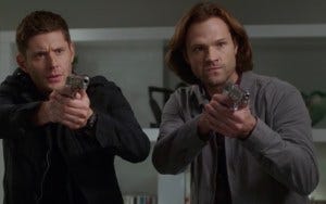 But before that, Sam realizes the therapist really is a shapeshifter, thanks to the bloody mess in the upstairs bathroom, which means we get to see badass Winchesters pull their guns.