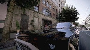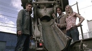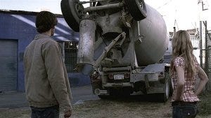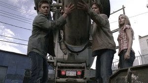 There’s the sound of a back up alarm on a truck and a big cement mixer backs up to them, classic rock playing and badass Dean Winchester driving.