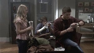 Jo protests that she didn’t belong there, feeling like “a freak with a knife collection”, which is something we know Sam experienced too, no matter how much he wanted to fit in and get away from the hunting life.