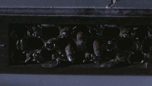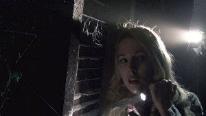 Meanwhile, in another apartment in the building, another young blonde woman comes home and encounters the black goo and flickering lights and once again she does NOT run away immediately in spite of all of us screaming at her to “Run, lady, run!” A crack starts in the ceiling and runs across the length of the room as the woman FINALLY tries to leave, but by that time she can’t get out. The crack reaches another grate and those creepy fingers come through, pulling her down to the floor and into the grate opening. Uh oh.