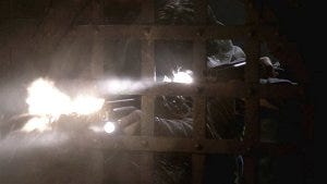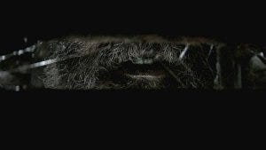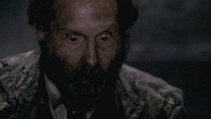 We see a bearded face, ugly teeth, peering through the slats in the wall where Jo knows she can’t get away from him. It’s absolutely terrifying.