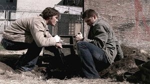 They find a metal trap door and pull it open, then climb down the ladder with their flashlights – another very cool Kim Manners shot.