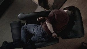Back at the rented apartment, we get to see Dean sleeping curled up on a couch in a truly uncomfortable looking position, which I guess is a way of telling us that when you’re a hunter, you sleep when you can and where you can and you shut up about it.