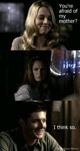 The recap reminds us of that amusing moment when Jo asks Dean if he’s really afraid of her mother, and Dean admits with a nervous smile, “I think so.”
