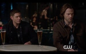 The ending scene was my favorite of the entire episode. Sam and Dean sit on the floor next to each other, drinking beers, Dean still bloodied and looking ridiculously hot anyway, Sam with his shirt still torn half open. Rowena sits across from them, makeup streaked down her face from her tears.