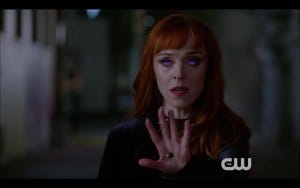 Oh, and Rowena is also incinerating (with her beautifully VFX’d violet eyes) some big pharma executive who apparently got lots of people killed.