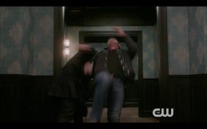 Also in the midst of the epic fight scene, Reaper Jessica tells Dean he’s doing a good job but that he’d better hurry.