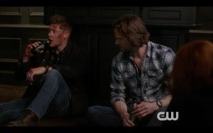 She starts to make a comment about being “especially fond of Sam’s impressive…” and both we and Sam are quite certain for a moment that she’s talking about the size of what he’s packing. Possibly I’ve read too much fanfic, but clearly so has Steve Yockey. Turns out she’s just referring to his impressive extensive array of hair products, much to Sam’s relief. But the fact remains that she’s seen Sam and Dean do pretty much everything they’ve done in the past months and that means Jessica has been watching some pretty interesting Winchester-centric….err….stuff.