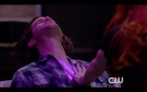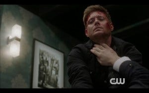 Eventually Dean gets the upper hand and chokes Bernard into what I presume is unconsciousness. There’s no way Dean Winchester bloodied and bruised, determinedly choking some bad guy out, should be so hot, but there you go.