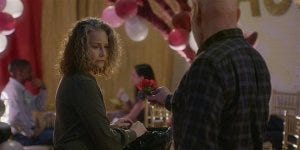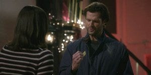 As I said, this show loves its pointed transitions (sometimes a little too much), so the flowers on the wristlet transition to the flowers that Cordell is picking to make a corsage for his daughter to give to her date. Emily appears (in his subconscious) to chide him about not including dandelions, because “those are weeds, babe.”