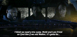 The storm is getting worse by then, as Trey and Micki and Walker drive right into it, trying to figure out what their “trio name” should be. (It’s okay, writer, you can say “ship name” if you want.) Micki comes up with “Trickier” because she and Trey are already “Tricki” which, again, this is a fandom savvy writer because that really is their ship name, and I’m enjoying it.
