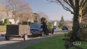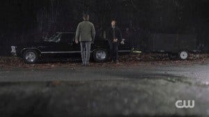 There’s a gorgeous ending shot of Baby as Dean and Cas get in, and Sam walks around to the passenger side, stopping to cast a glance at the box on the trailer.