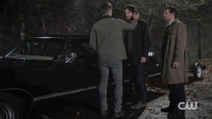Back to the main story line. Cas stays behind to fill Donatello in on the history he mercifully does not remember, and Dean goes outside to find Sam leaning against the Impala. Like so often as an episode ends, Sam tosses Dean a beer and they sort of celebrate their win.