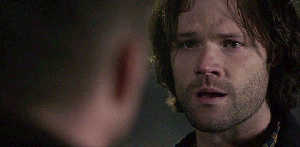 The question and the broken way Sam asks it, the way he’s clinging to his big brother, clutching a fist full of the back of his jacket, and the tears shining in his eyes, all telegraph the child Sam was, the boy who only had his brother and who loves him like a mom and a dad and a best friend too. Someone posted that Sam and Dean always hug the same way, and that Dean grabs Sam around the neck as though he’s still the taller one. In this scene, it’s like he is – the way it’s blocked almost makes Jared look shorter than Jensen, making Sam look every bit the little brother pleading for his big brother to stay with him. Many fans commented that Sam actually looks like a much younger version of himself in this scene, so complete is the transformation into little brother.