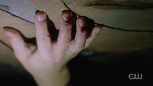 Dean wakes up with a start, fingers bloody from scrabbling at the wall, and Sam appears in the doorway, worried (no doubt having heard his brother screaming for him).