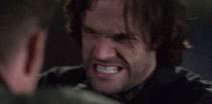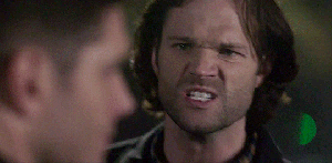 Sam is so enraged at Dean’s refusal to listen, and so desperate to get through to him, that he starts pounding his hands against Dean’s chest, like a two year old would when they’re at the end of their rope and nobody is listening to them. The gesture rang so true, seemed so real, and I don’t even know if it was scripted or not – Jensen/Dean reacts with surprise, glancing down like he can’t believe Sam put his hands on him – but the physicality of it carried the scene, made it a thousand times more intense.