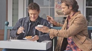 Sam looking to share his pie – or pie his brother in the face? Episode still or behind the scenes hijinks? Hmmm. Dean sure looks happy though.