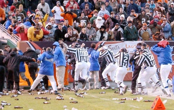 Cleveland fans pelted the field with plastic beer bottles in a 2012 game that saw some calls go the other way. Browns fans could get a pass for their outburst after all the terrible things that have happened to their franchise.