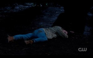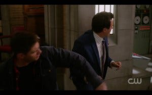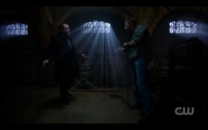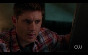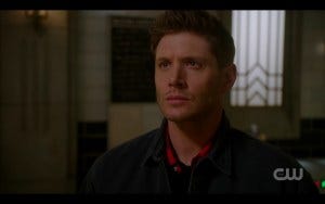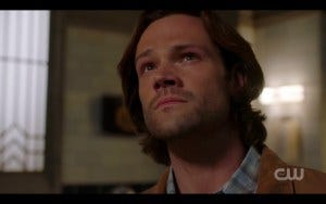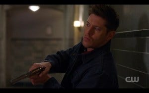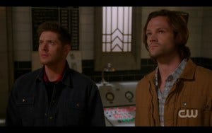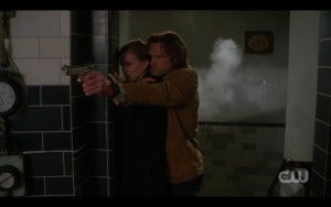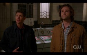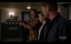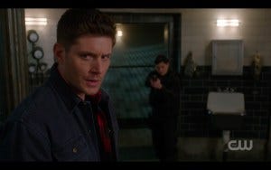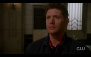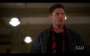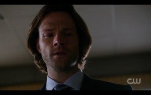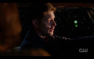There were some things I liked. As someone in the room pointed out, the episode did not lose my attention the entire time. I was not bored, though sometimes that lack of boredom was more incredulity than anything. But the acting and the directing, and yes, some of the writing too, certainly kept me watching. I thought all the actors did a great job with what they were given – Jared especially brought a lot of emotion with his portrayal of Sam’s reaction to Eileen’s death. In almost no time and with almost no lines, Jared was able to show us the depth of Sam’s grief over losing Eileen, which I so appreciated. Jensen didn’t have lines about it either, but his expression of grief and later his clear concern for Sam’s grief were right there on his face.
