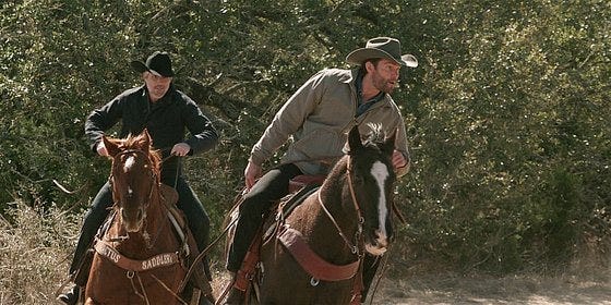We see the slice in the girth of Cordell’s saddle as the horses and riders gallop away.