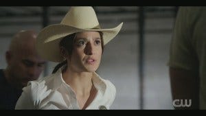 Stella gets a tip call from a woman who wants a reward for sharing information, and Stella impulsively offers that (nonexistent) reward to keep the woman on the phone – and then goes to deliver it herself instead of telling an actual Ranger. Dumbest idea ever! Also did the woman think if a real Texas ranger was coming, that they would have brought money? Or that they could have overpowered actual Rangers? Augie catches her frantically searching for money and insists on coming with her.