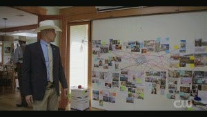 James is furious at Cassie, calling in favors to keep her out of custody, but they pursue the lead on Julia Johnson, who is also missing. Cassie finds a pin board at Julia’s house that looks almost John Winchester worthy, and they also find an article about Sean and the operation he’s running – that Julia was doing an expose on. Cassie also finds a brochure for the closed psychiatric hospital, and they send some cavalry over there.