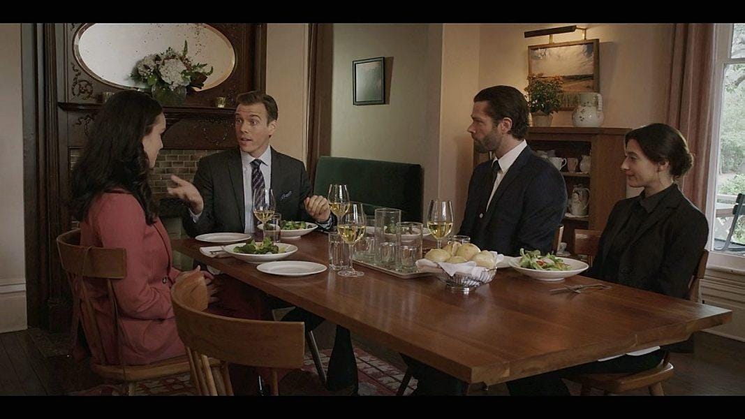 The lunch also has its comedic moments, like when Cassie pushes Cordell to ask Kevin if they’ll be getting medals as part of the “honoring”. Jake Abel tweeted that Jared’s delivery of that reluctant question broke him several times, which I can only imagine.