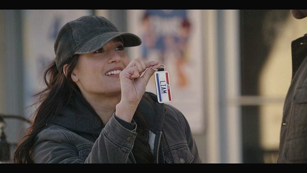 After volunteering at the charity yard sale (Rangers for Paws, which is similar to a real life charity that the “Supernatural” fandom has done charity events for, Paws 4 AKF, a nod to Jared’s mental health campaign Always Keep Fighting). Anyway, Cassie surprises Liam with a gift – a little license plate with his name on it. A new “thing” that has some special meaning. He gives her virtual tickets to Bot Fights, like the poster that she had – for both of them.