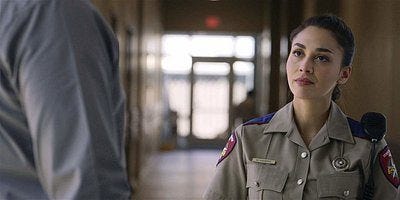 We jump again to 2 months ago, Micki when she was still a police officer and not a Ranger, siren on to pursue a jeep speeding. The woman driving says she always did have a lead foot, and comments that it was smart of her boss to send a woman, that she can tell her boss is a man by her nonverbals. The two women banter, both trying to get the upper hand, and Crystal shares that she was on her way to see her son and got a bit lost in it – that she’s been out of town, probably working too much.
