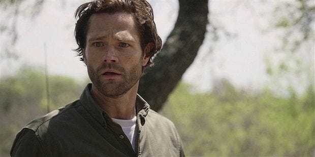 He goes outside saying he’ll be right back, assuring everyone that he’s fine (he is not), and Jared Padalecki looks strikingly handsome wandering around outside in his fitted black suit. He also looks entirely lost, both the way the scene is filmed and the way Padalecki holds his body evoking loneliness and loss.