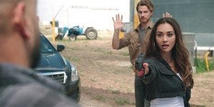 Micki, of course, is not going to let that happen. In the gunfight that ensues, Garrison ends up over the ledge, hanging on to Micki’s hand and dangling over a drop too high to survive. Lindsey Morgan, in my opinion, had her strongest scene of the entire series in that one, her absolute anguish in trying desperately to hold onto her one-time lover as he clings to her almost too realistic to watch.