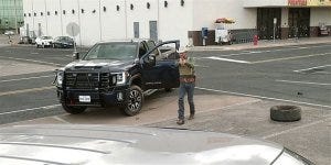 Walker gets out and approaches the crashed truck.