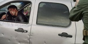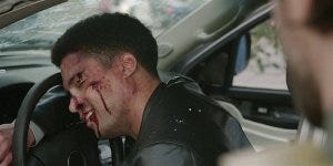 Serano is slumped over the steering wheel, bleeding. He smirks.