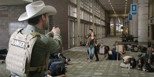 Dan meets with Serano, trying to bluster his way into making Serano keep his word, when Walker shows up and a gunfight breaks out in the crowded station, Walker yelling “Texas Rangers, everybody on the ground!”