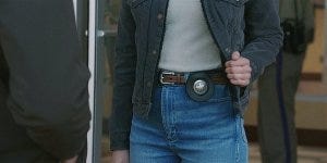 She accuses him of being dressed like the perp; he retorts that he’s dressed like a Texas Ranger because he is one – and that the perp is dressed like HIM!