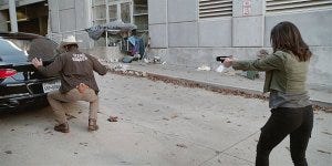 Cassie and Walker find the warehouse with the stolen cars, working together seamlessly with unspoken hand signals ala Sam and Dean. Cassie has a weapon that’s not a gun but it works really damn well and they eventually take out the bad guy – who is not her lost partner but just taking advantage of an opportunity.