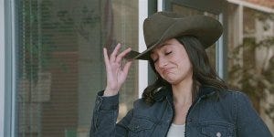 Walker tips his hat without answering and Cassie tips hers back.