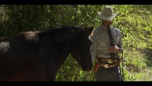 He grabs his rope, follows the horse’s tracks, and catches up to him after a very pretty scene of long-legged Padalecki walking through a stream bed.