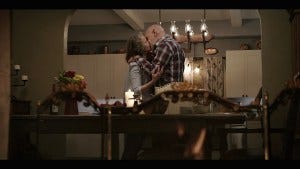 Bonham cooks dinner, a “healthy alternative”; Abeline claims that he’s stressing her out with an all lettuce diet or asking her to wear monstrosities that come up to her knee. Bonham walks out, head down. Abby sighs, thinks better of it and goes after him – to find a beautiful table set by candlelight with flowers, Liam in the kitchen too. Bonham promises not to go overboard, confesses how terrified he is to go on without her in life.