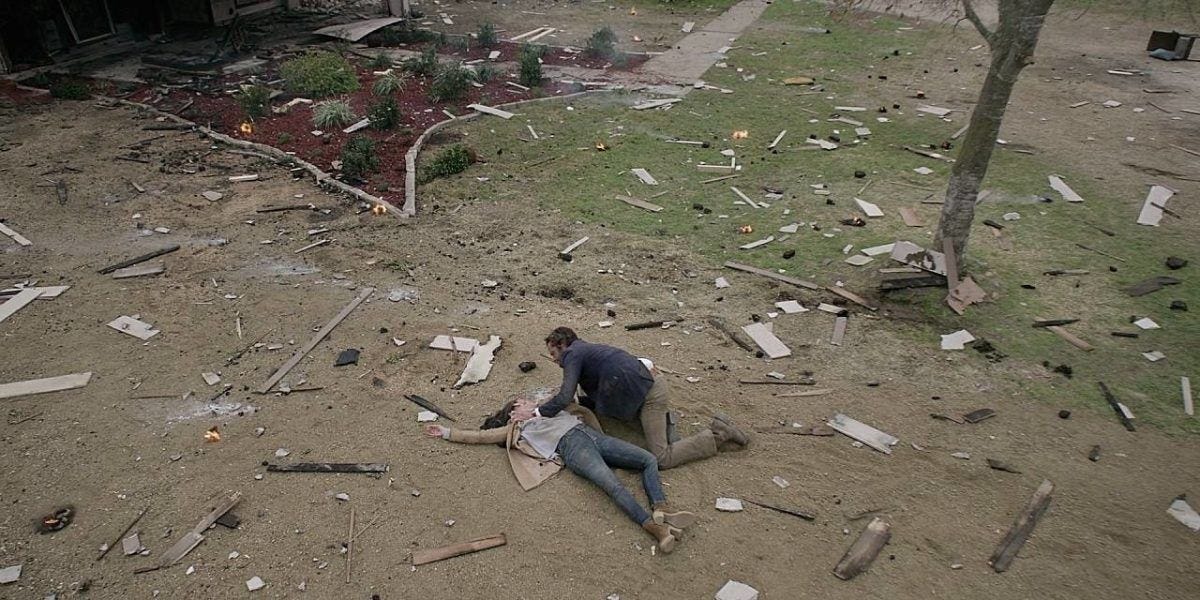 He crawls to her through the smoke and debris, then gently turns her over.