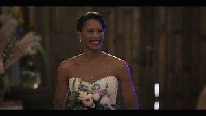 Sadie claims to not want the bridal bouquet, saying she’s obsessed with weird traditions that women have to start questioning more – but then she catches the bouquet with a cookie in her mouth. I like Sadie.