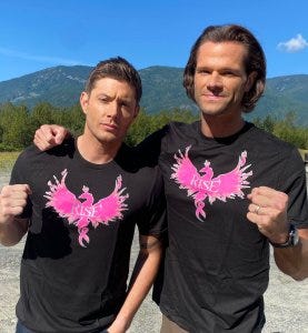 Also last week, Misha, Jared and Jensen joined most of their fellow cast members in posting their support of Samantha Smith in her fight against breast cancer, modeling the Rise tee shirts from Stands charity campaign. We’re all sending so many good wishes your way, Samantha!