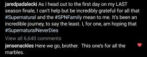 A little while later, Jensen posted a video on Instagram, and this time both Misha and Jared responded, reaching out to empathize with and support their friend. Jensen’s video was like a dam breaking. When he held up the script that does not – like every one of the 326 scripts before it – end with “To Be Continued” and instead says “The End,” I lost it completely.