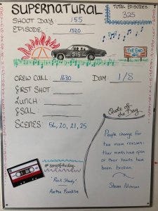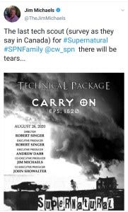 That same day, producer Jim Michaels tweeted that they were starting the tech scout for episode 20 – the very last Supernatural episode ever. Jim was emotional in his tweet, and I was very very emotional thinking how many times I’ve thrilled to see Jim’s technical package tweet over the years, and how this is the last one I’ll ever see. I love that everyone involved with this show has been so interactive with the fandom; it has made such a difference. Damn. More tissues.