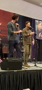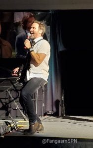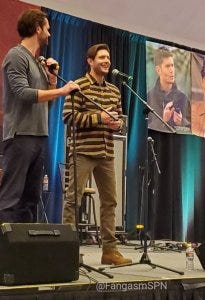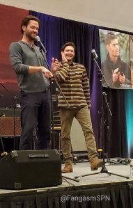 They also did one of the things I’ve seen them do more than once in a panel, but neither they nor I ever get tired of it – demonstrating how they filmed a vamp kill on Supernatural. Because a) they are so good at it and it looks so smoothly executed, and b) They are so amused by it that I love to see it.
