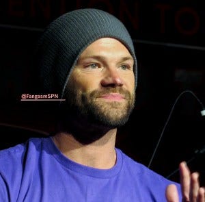 Jared was wearing a replica of the famous Sam Winchester purple dog shirt, to the appreciation of pretty much everyone – including Jensen.