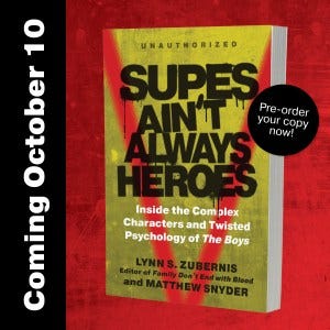 Before I go, a bit of news! If you haven’t seen the announcement yet, we’ve got a new book coming out in October 2023 – it’s a deep dive into the hit Prime Video show ‘The Boys’, with chapters from psychologists, sociologists and media experts about what makes those complicated characters tick and how the show gets away with challenging alot of things that are a problem in real life. Plus exclusive interviews with Jensen Ackles, Jim Beaver, Aya Cash, Nathan Mitchell and the co-creator of the comics, Darick Robertson.
