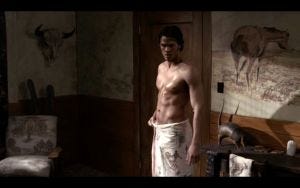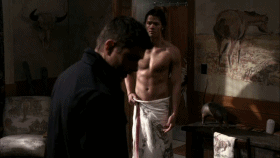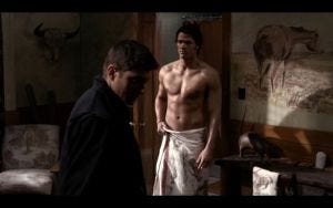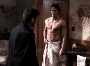 Theme of the episode again. Back at the motel, the prank war escalates. Dean puts itching powder in Sam’s underwear while he’s in the shower – and we get one of the most well known scenes of the entire series as Sam Winchester saunters out in a low-slung towel and Dean gets flustered.