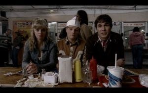 They talk to the manager of an old school record store, posing as reporters. The guy tells them he’s a writer too, for the school’s literary magazine.