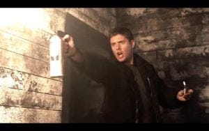 Sam calls out for Dean and he comes running, spraying the flame thrower and banking on the fact that Mordecai can’t leave the house.